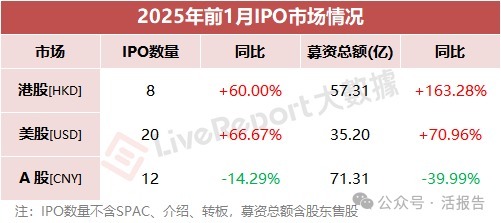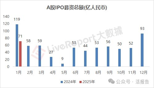 A股2025年1月共12只新股IPO上市,同比下降14.3%,合计募资约71.3亿人民币,同比下降40%。A股IPO低迷势头尚未扭转,月内仅1只新股募超10亿人民币,但上市新股首日全线涨超100%,其中多只首日涨幅高达3、4倍。