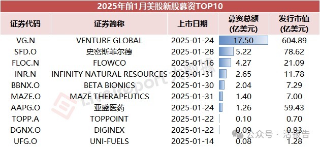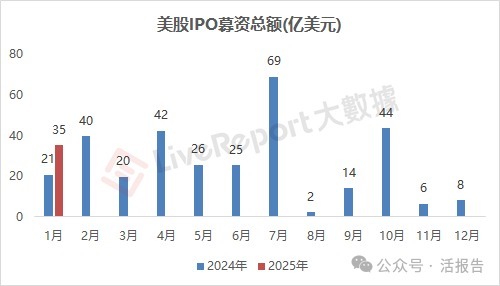 美股2025年1月共20只新股IPO上市,同比增长67%,合计募资约35.2亿美元,同比增长71%。中概股呈现“上得多募得少”特点,亚盛医药成功实现H+U;LNG巨头Venture Global、万洲国际旗下史密斯菲尔德相继上市。
